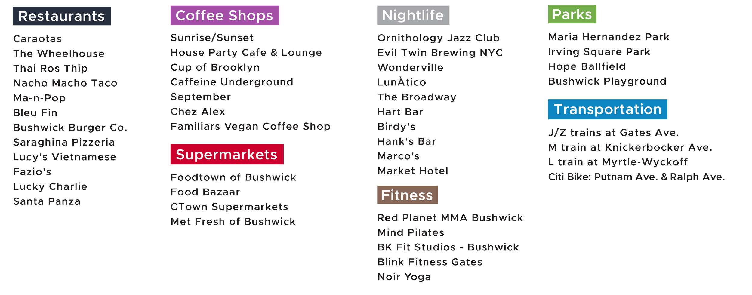 Perfectly positioned at the crossroads of Bushwick and Bedford-Stuyvesant - and just moments from the M, J, and Z trains —TEN27 puts you within convenient reach of Brooklyn’s best restaurants, nightlife, galleries, shops, and parks, while offering a short 20-minute commute into Manhattan. From savoring a meal at a neighborhood favorite to browsing cutting-edge art at any of the numerous local galleries, shopping at one-of-a-kind vintage boutiques, or enjoying a quiet afternoon in any of the many local green spaces, TEN27 puts the very best of Brooklyn right at your doorstep.