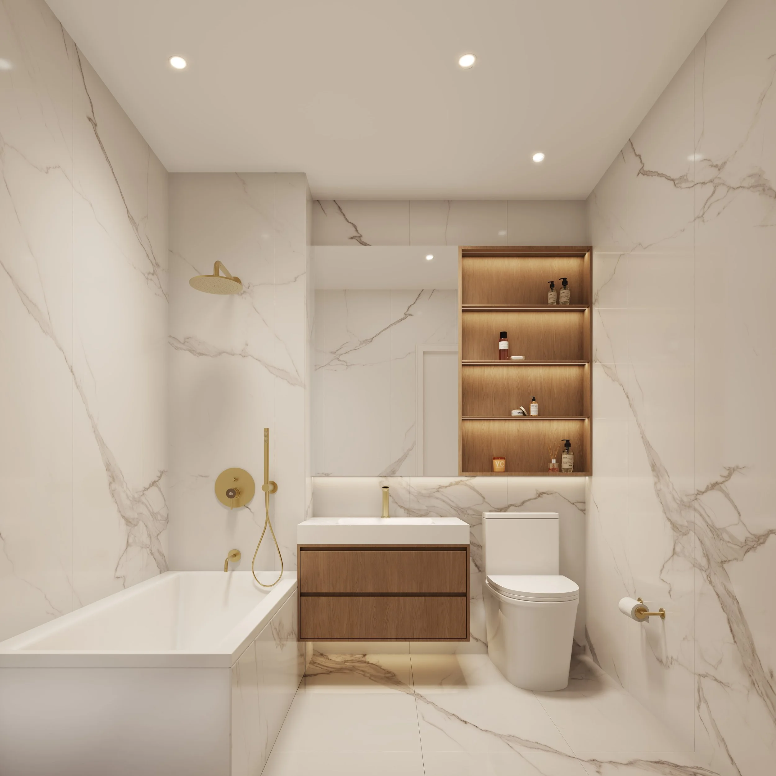 Spa-inspired bathrooms offer radiant heated floors, smart toilets, walk-in showers, soaking tubs, and custom floating vanities with bronze fixtures that lend warmth and refinement. Each residence also includes an in-unit Bosch washer and dryer, multi-zone heating and cooling, a smart lock entry system, and generous storage throughout. combining modern convenience with understated sophistication.